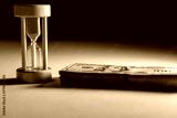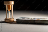 Hourglass Beside Stack of Cash Illustrating the Passage of Time and the Value of Money in a Simple Setting
