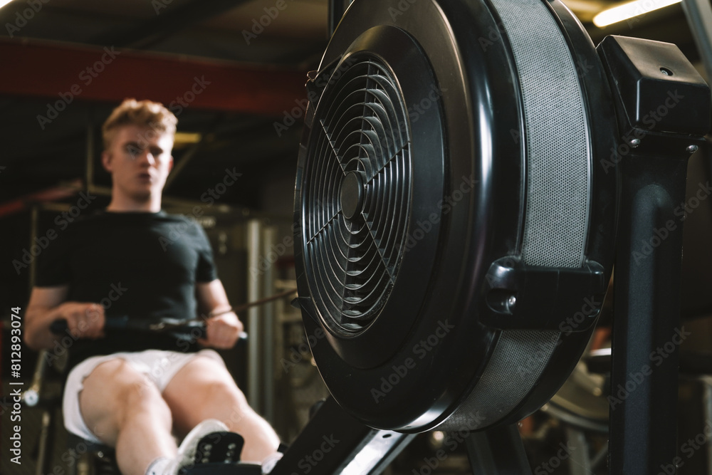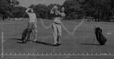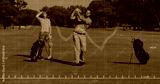 Swinging mature male golfer hitting golf ball past two golf bags on fairway, with analytics overlay