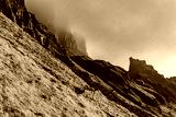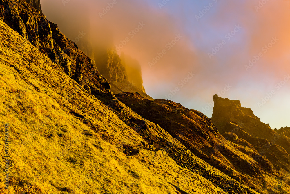 Golden sunrise light illuminates the Quiraing mountains on the Isle of Skye, Scotland, creating a magical landscape of mist, cliffs, and glowing hills in early morning atmosphere.