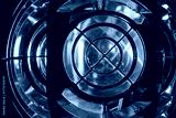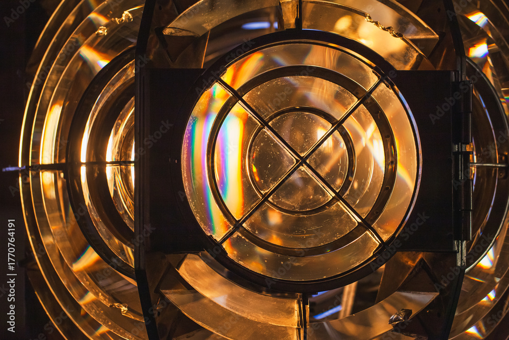 Lighthouse lamp is glowing behind a Fresnel lens, showcasing its prismatic design