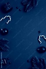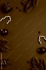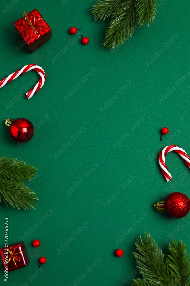 A festive Christmas flat lay with decorations on a dark green background. View from above, vertical composition