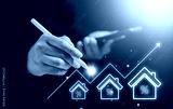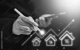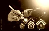 A person analyzing rising house prices with digital percentage graphs, symbolizing real estate investment, mortgage trends, and housing market growth in the digital age.