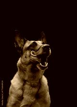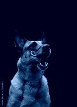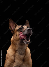 The dog slightly turns its head as it licks its nose, captured on black background in a studio close-up.