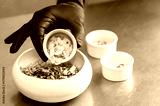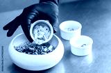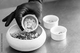 A person in black gloves adds sliced almonds to a bowl of granola, nuts, and seeds on a metal counter. Close-up, food preparation, healthy eating concept