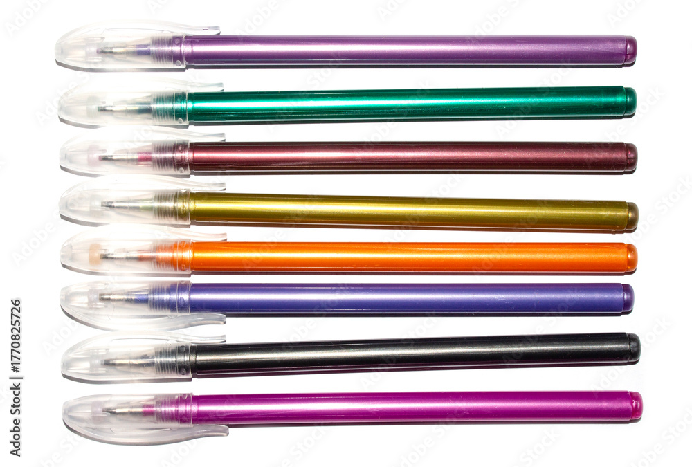 A set of colorful gel pens on a white background.Gel pens with mother-of-pearl.Gel pens for signing postcards.Gel pens background.