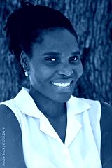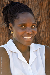 portrait single young african woman smiling, braids, dreadlocks hairstyle, white blouse