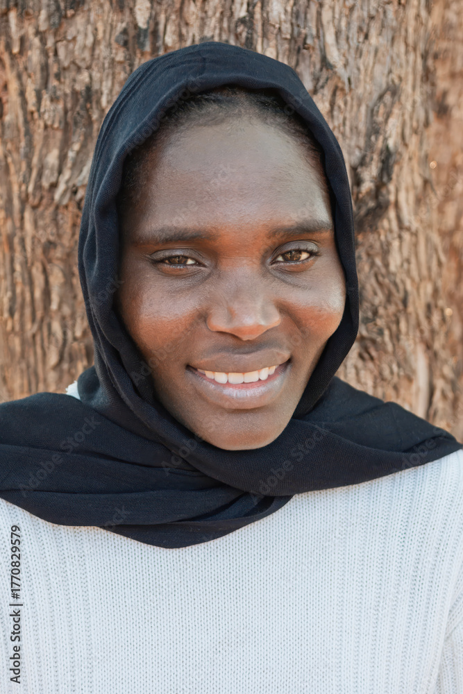 portrait single young african woman smiling, practice head covering as a sign of obedience, modesty, and reverence to God