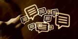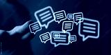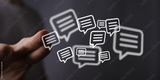 A person's hand holding digital speech bubbles, symbolizing messaging, dialogue, and communication. Perfect for business, social media, and digi