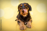 Dachshund Terrier mix dog lying on yellow background with bokeh lights
