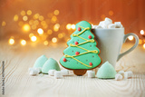 Christmas tree Cookies decorated with icing sugar and sweets on background with christmas lights. Christmas tree. Greeting card.