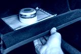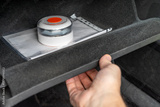 Hand opening car glove compartment with connected V16 emergency warning beacon with GPS geolocation