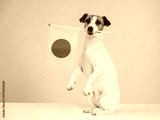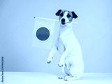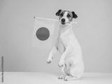 Jack Russell Terrier dog holding a Japanese flag on a white background.