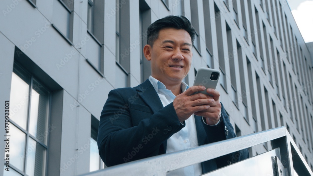 Asian middle-aged business man smiling typing mobile phone in city near office building happy Japanese businessman using smartphone standing on stairs Korean Chinese male chatting online internet