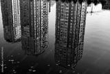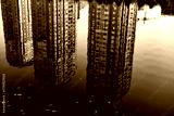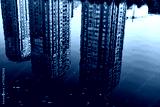 Abstract reflection of skyscrapers in calm blue water creating a unique visual. The mirrored buildings create an interesting pattern on the water's surface. Modern urban architecture upside down.
