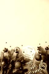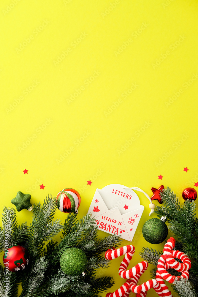 Christmas bottom border with Santa letter envelope, pine branch, candy cane and bauble on yellow background, festive seasonal decoration.