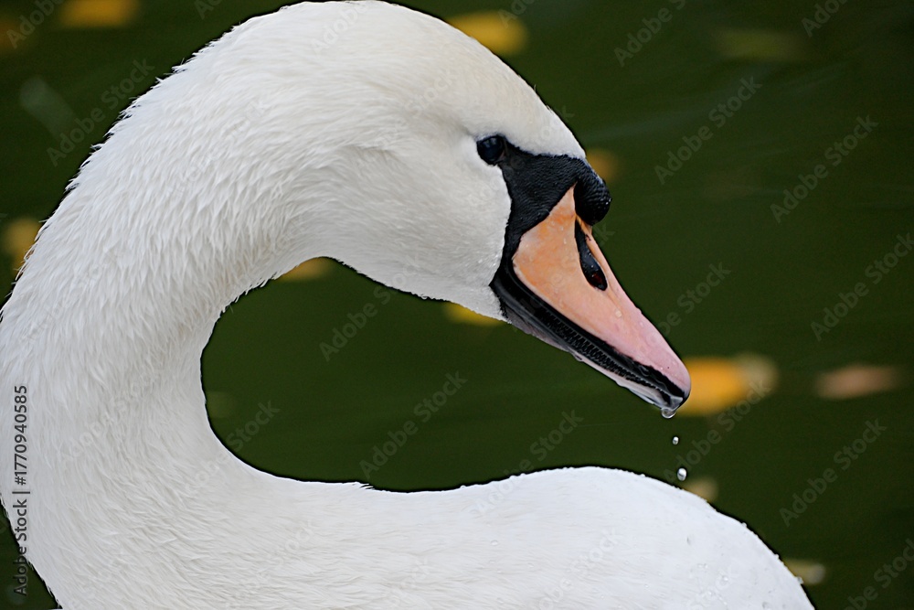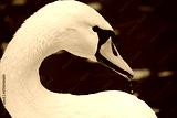 Close-up profile of a white swan's head. Emphasize the S-curve of the neck, the soft plumage, and the gentle eye. Photorealistic, high resolution, shallow depth of field.