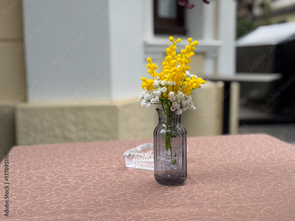 Yellow and white flowers in a glass vase on a cafe table. Minimalistic outdoor setting, elegance, and gentle color harmony.
