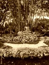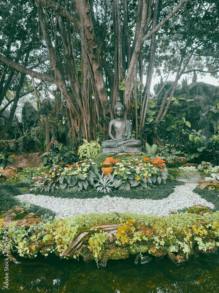 Beautiful buddha sculpture on a green outdoor garden with trees and flowerbed and water pond in Thailand