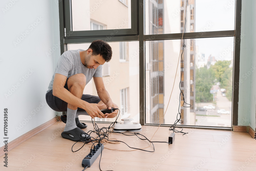 Professional window technician male managing robotic cleaning equipment, preparing automated system for servicing high-rise building exterior, demonstrating advanced maintenance technology.