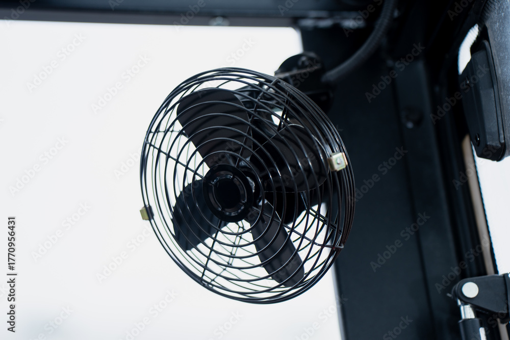 Compact industrial cabin fan with black protective grille and adjustable mounting bracket designed for forklift operator cooling and efficient air circulation in workspace environments