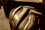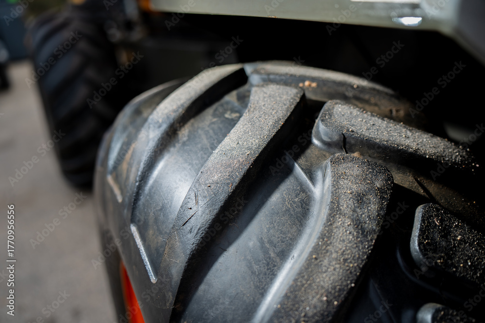 Close-up of large industrial tire with deep tread pattern covered in dust showing durable rubber construction and traction engineering for heavy-duty machinery applications