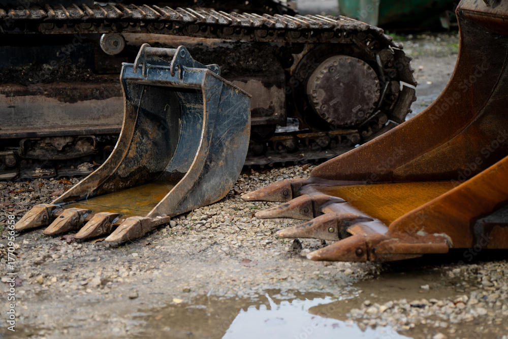 Excavator metal buckets with reinforced teeth and hydraulic connectors resting on gravel surface beside crawler tracks showcasing industrial excavation equipment durability and precision design