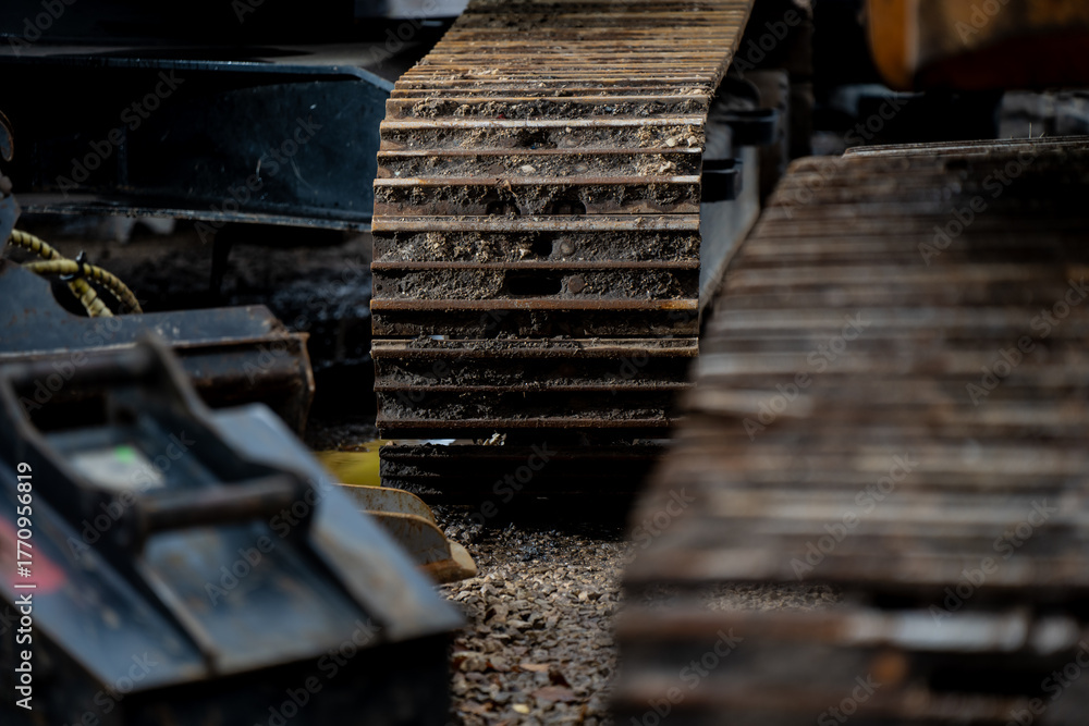 Close-up of excavator steel crawler track with visible dirt and worn surface showcasing robust industrial construction, traction durability, and heavy-duty engineering precision