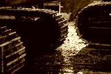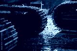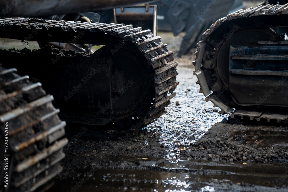 Two excavator steel crawler tracks positioned on wet muddy surface showcasing heavy-duty traction design, durable engineering, and industrial machinery performance in harsh conditions