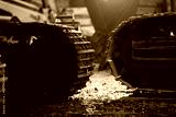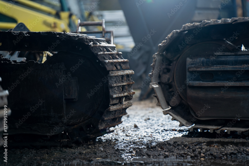 Muddy excavator tracks on construction site representing strength, reliability, and power of industrial machinery working in rough terrain and challenging outdoor conditions