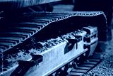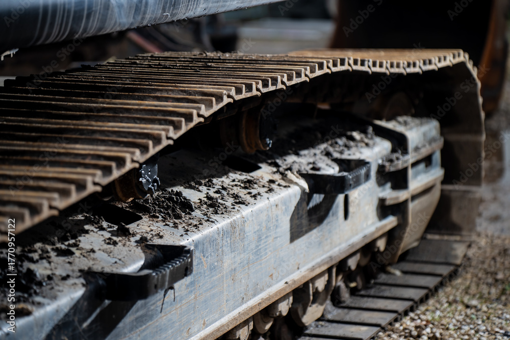 Detailed excavator steel crawler track with visible rollers and mud deposits showing advanced traction engineering, load distribution, and industrial durability in construction machinery