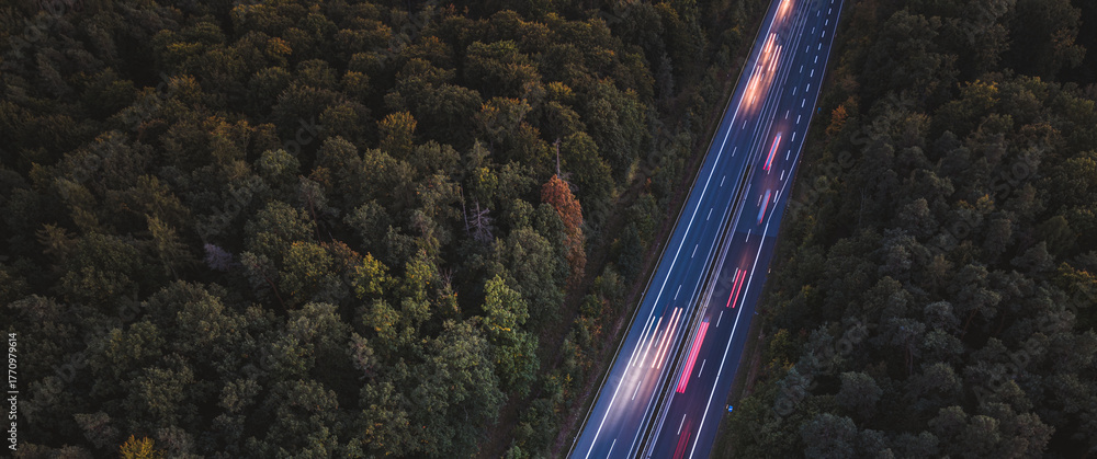 Aerial view of the Autobahn between the forest at dawn, long exposure