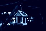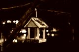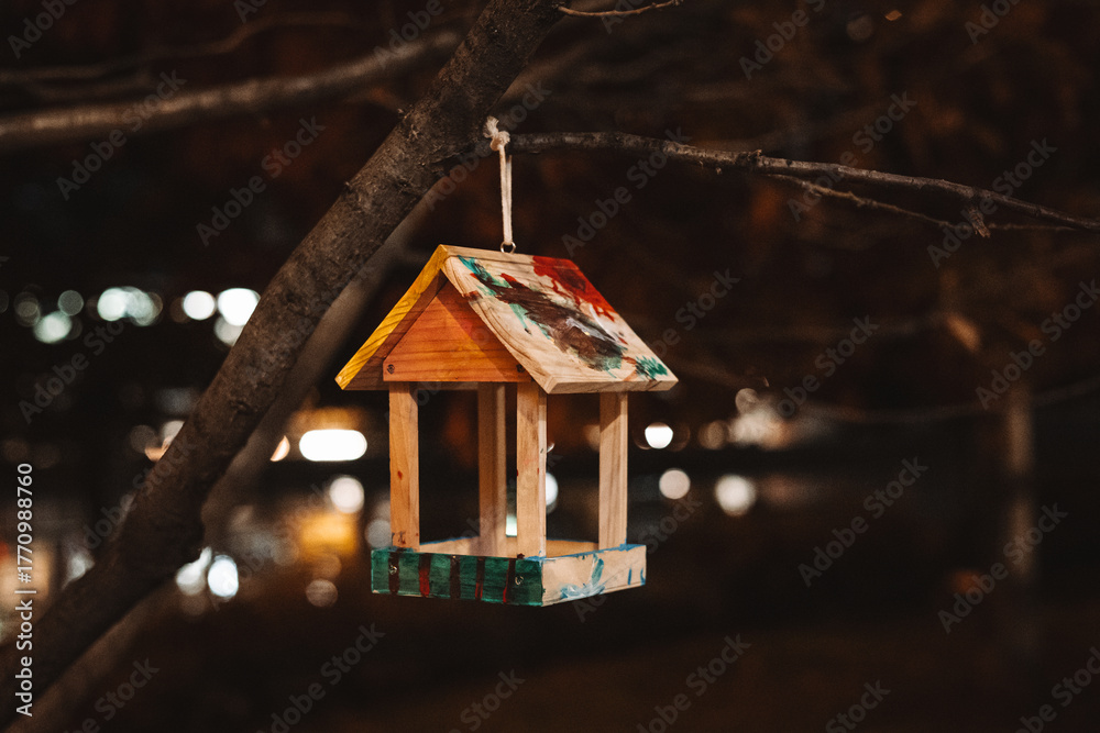 Handmade bird feeder hanging from a tree branch at night with bokeh lights. A wooden bird feeder is suspended from a tree branch, illuminated against a blurred background of lights. Birdhouse in park.