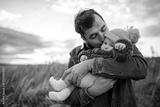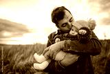 Happy man kissing his little baby girl walking outdoors. Father holding infant daughter wearing fall brown sweater and yellow hat