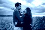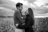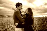Young family couple holding baby girl walking on fall meadow. Stylish mom, dad and daughter wearing warm fall clothes.