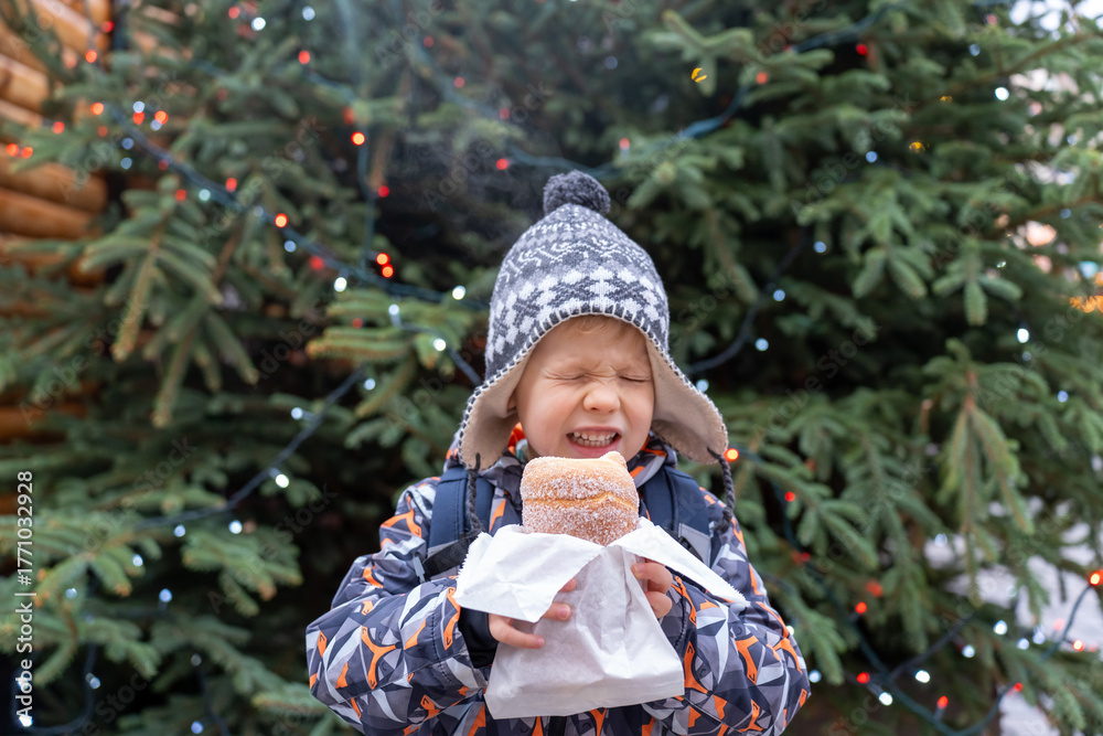 Excited little boy in winter hat holding sweet pastry with jam from paper bag with wide smile near Christmas tree with lights. Concept of holiday treats and childhood joy celebration.