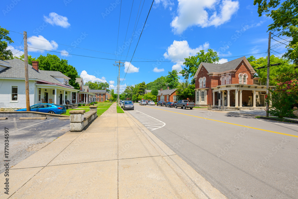 Historic stately homes along a residential street in downtown Franklin, Tennessee, site of influential battles during the American Civil War.