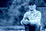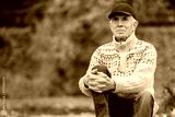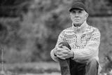 Portrait of pretty senior man in cap sitting in colorful autumn park. Pensioner resting outdoors. Beutiful fall.