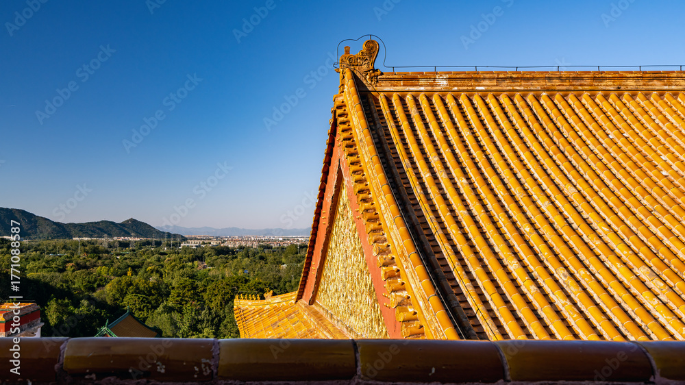 Traditional Chinese roof with golden tiles under clear blue sky