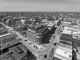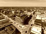 Historic commercial buildings aerial view on Monroe Street in historic downtown Monroe, Michigan MI, USA.