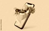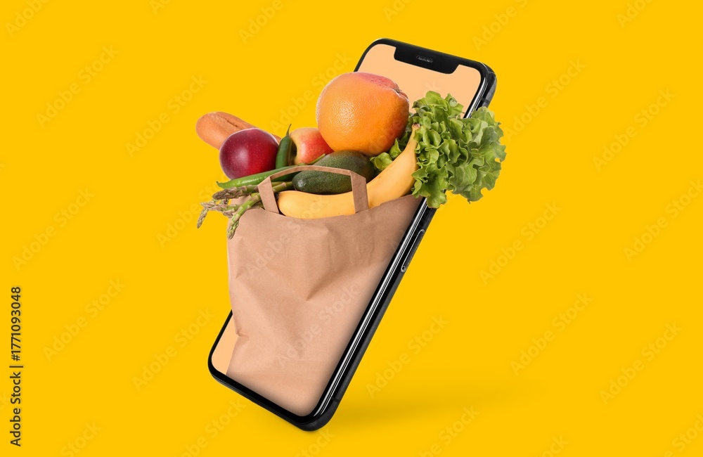 Mobile phone with grocery bag popping out of screen on yellow background
