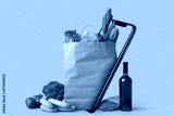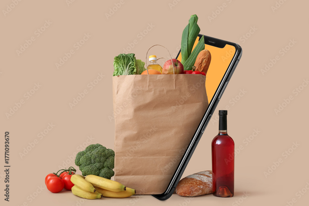 Paper bag with different groceries on beige background