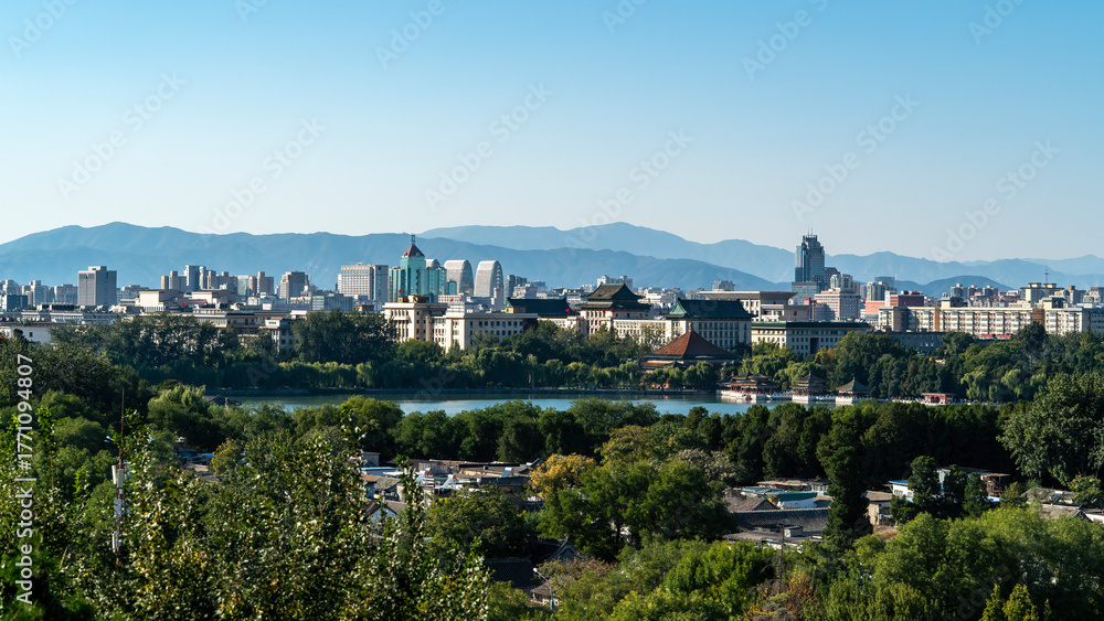 Scenic view of cityscape with lake and buildings in the background