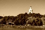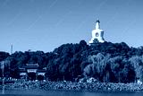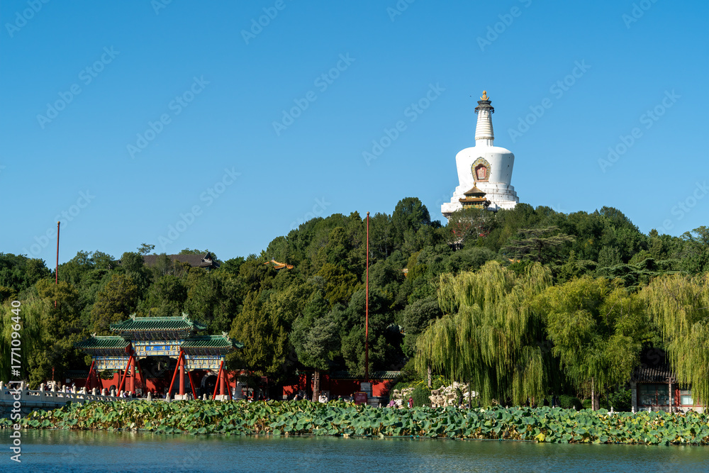 White Pagoda in Beihai Park with clear blue sky and surrounding trees