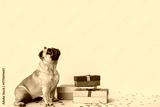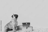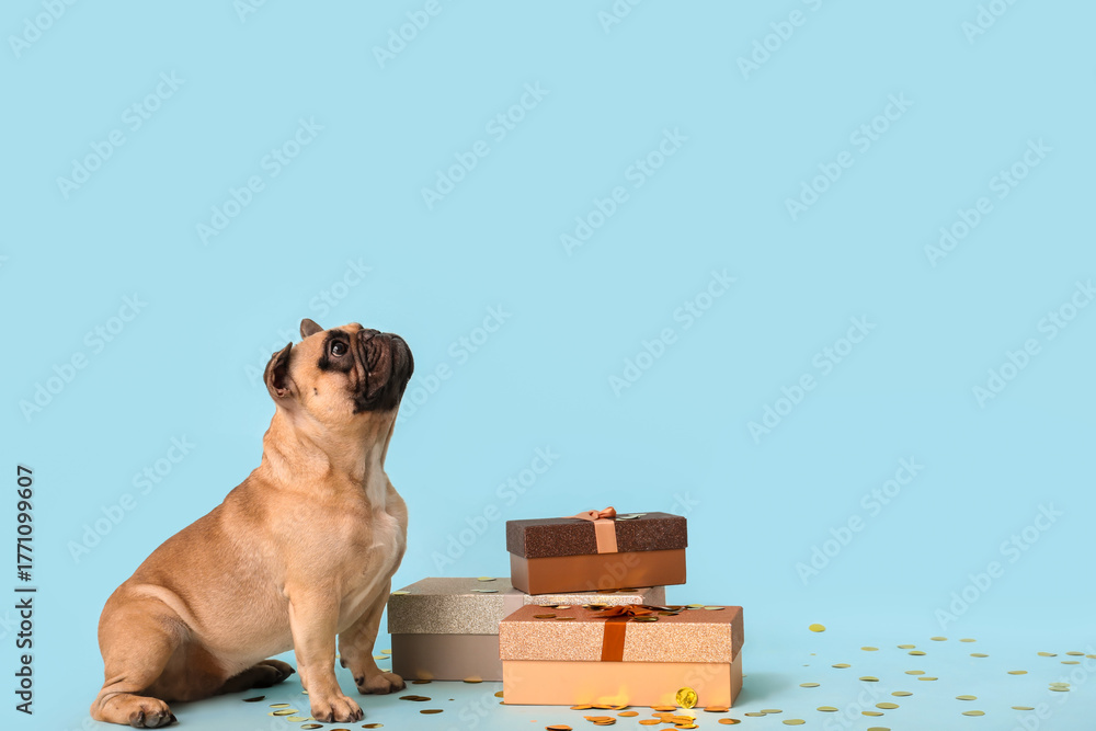 Cute pug dog with gift boxes and confetti sitting on blue background