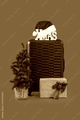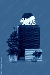 Suitcase with word XMAS, Santa hat, fir tree and gift on red background