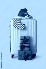 Suitcase with Santa hat, Christmas sock and presents on blue background