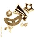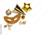 Carnival mask, party hat and Christmas decor on white background