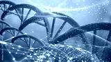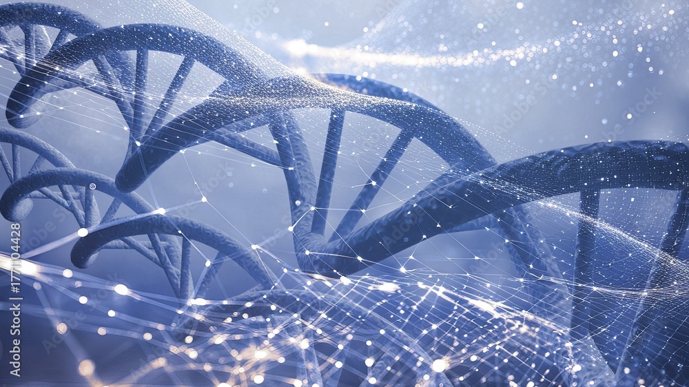Spiral DNA double helix structure on blue background.