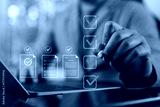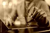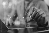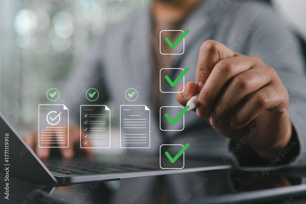 Prepare check and approve concepts. Document management, paperless. Man touching on virtual screen to tick mark documents for online approve paperless quality assurance and ERP management.