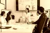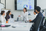 Asian businesswoman discussing performance data with colleagues during a marketing and data analysis meeting in a modern office